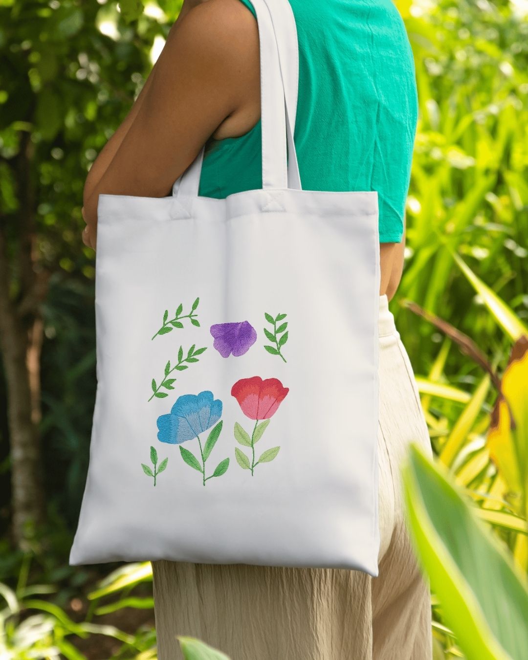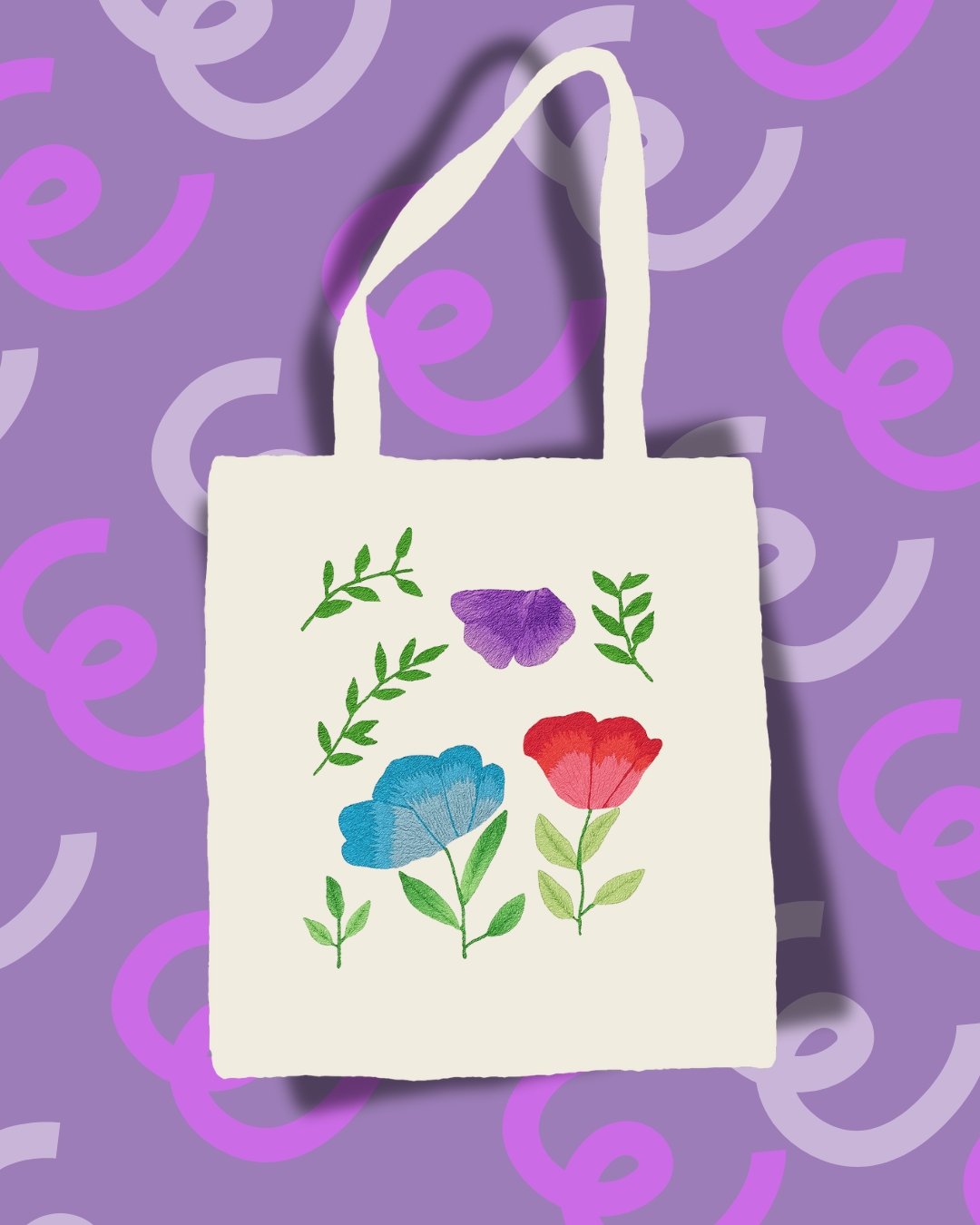 Tote bag en tela tipo lienzo, bordada completamente a mano con flores coloridas y delicadas.